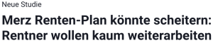 Bis zu 2000 Euro dürfen Rentner steuerfrei dazuverdienen und trotzdem will keiner? So gehts ja wohl gar nicht. Merz hat schon einen Acht-Stufen-Plan auf dem Bierdeckel: 1. das Losverfahren kommt zum Einsatz; 2. Freiwillige bekommen doppelten Sold; 3. staatlich finanzierte Zweistufen-Treppchen für den Arbeitsantritt; 4. stabile Rollatoren für die Arbeitswege; 4. anständiger Hinterbliebenenbonus; 5. ausgemusterte Spezialisten werden wieder eingemustert; 6. ein neues Hörgerät pro Ohr mit angenehmen Kommandotönen; 7. ein Herzschrittmacher mit Schrittzähler: linkszwodreivier…; 8. nach zwei Monaten an der Front der Werktätigen bezahlten Heimaturlaub auf Mallorca