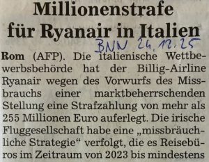Ryanair muss 255 Millionen zahlen wegen Wettbewerbszeug. Da hat diese Fluggesellschaft für Schmalbeutler zig Millionnen Tonnen fossil-Co2 in die Atmosphäre pumpen dürfen und jetzt war alles umsonst? Das Mobilitätsbedürfnis von Millionen mündigen Geizkragen in die Tat umgesetzt für billig und den ganzen schönen Gewinn hat das Christkind geholt? Ja wofür versauen wir unser Raumschiff Erde, wenn dann nicht mal ein bisschen Zaster übrig bleibt?!? Heut abend vor der Bescherung singen wir: Leise rieseln die Kohlen/unsern Enkeln gestohlen/weihnachtlich zwitscherts im Wald/Freue dich, wärmer wirds bald. Halt, nochmal: Leise bieselt der Regen/in die offenen Krägen/weihnachtlich blinkt LED/drüben, beim Dealer, gibts Schnee. Halt, die Oma kapierts nicht. Nochmal: Ihr Kinder, ein Komet/Komet aus dem All/der kracht durchs Ozonloch und landet im Stall… Damit verziehen sich Oma und Opa und lassen den Nachwuchs zurück im hier und jetzt. Das ist der wahre Enkeltrick.