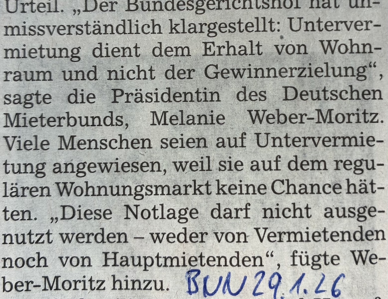 Der Bundesgerichtshof hat entschieden: Untervermietung dient nicht der Gewinnerzielung, die Notlage von Umtermietern darf nicht ausgenutzt werden. Soweit der BGH. Gut und gerecht, BGH, aber wann gilt das auch für die Notlage von Mietern? Wie lange darf die noch ausgenutzt werden?
