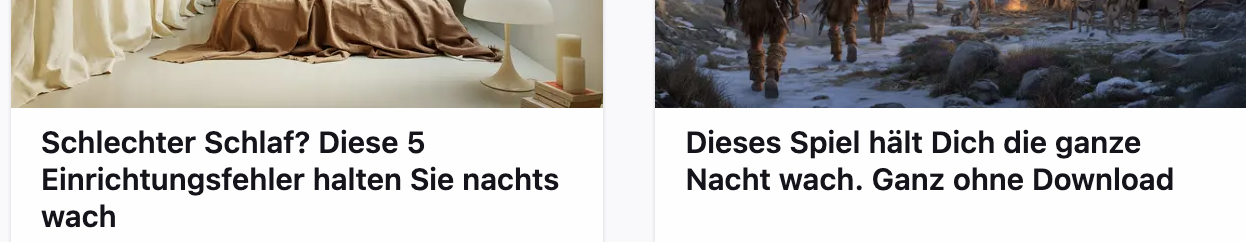 Zwei konträre Anklickzeilen nebeneinander: Absicht? Übermüdete KI? Aber lehrreich: Die eine hat die Bude falsch eingerichtet, deswegen kann der andere nicht schlafen und spielt dauernd dieses Computerspiel, weswegen die eine kein Auge zu bekommt. Oder andersrum, aber jetzt weiss man, warum