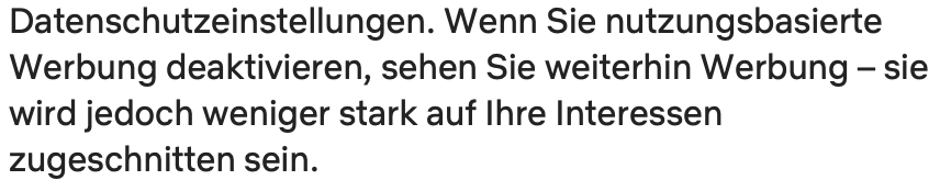 Soeben kommt eine mail von Netzflix, irgendwas mit Nutzungsbedingungen und dass man sich scheints aussuchen kann, wer einen behelligen darf. Es nennt sich nutzungsbasierte Werbung. Wenn man die deaktiviert, sieht man Werbung, die weniger stark auf die eigenen Interessen zugeschnitten ist. Ach, die kennen meine Interessen? Ja dann deaktivier ich lieber nix. Dann sagt mir endlich jemand, was ich für Interessen habe.