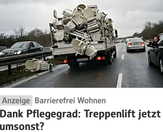 klickmotiv: „Dank Pflegegrad Treppenlift“ umsonst: Den Pflegegrad hat offenbar der LKW Fahrer, dem die schlechtverzurrten Dinger gerade auf die Autobahn purzeln. Die gibts dann umsonst, dank dem Pflegegrad des Fahrers. Jessas. Wer hat das getextet? KI oder was? Ihr Digitalopfer. Ihr Tiktoktrottel. Unser Beileid.