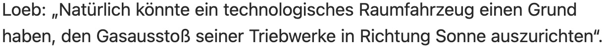 Ein Alienfahrzeug aus den Tiefen des Weltalls, das auf dem Rückstossprinzip beruht, wäre als echter Dinosaurier unter den Raumschiffantrieben schon ausgestorben, bevor man das Fahrzeug überhaupt wahrgenommen hätte. So eine Seifenkiste – und dann interstellar? Zig-Millionen Reisejahre? Ach Harvard, du und deine Forschung. Aber irgendsoein Muskoider Tech-Depp wird schon ein paar Milliarden dafür rausrücken.