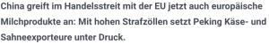 d höchste Einfuhrgebühren für Milch und Käse – urplötzlich rollen Chinas Zollpanzer massivst gegen europäische Butterberge und Milchseen an. Woher kommt dieser unerwartete Affront? Werden die regelmässig auftretenden Durchfallpandemieen neuerdings auf unsere Molkereiprodukte zurückgeführt? Ist uns etwa ein gentechnischer Käse aus dem Labor gerollt? Oder haben die erst jetzt gemerkt, dass ihnen die Enzyme fehlen? Also da können wir dann auch nix dafür.